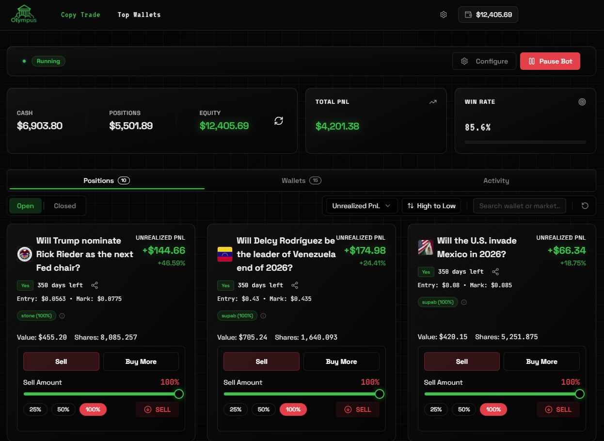 Olympus gives you a web terminal to trade on Polymarket: manually buy any market you want, browse positions, and manage your portfolio β€” all in one place. You can also view trader profiles to see performance, PnL history, and positions of top wallets before you decide to follow them.